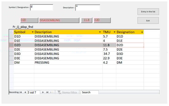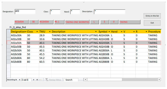 The software solution, called “MTM Calculator v2.0”, was developed with Microsoft Access®. It uses tables for basic movements from the MTM-1 system and includes standard movement sets for manual operations in sewing processes. Within the “MTM Calculator” software solution, in addition to developing technological tasks according to the MTM method (motion sets, basic movements or their combination), it is also possible to calculate the duration of machine–hand auxiliary sewing operations according to the RAV and ZAK methods and include them in the calculation of normal time for the entire technological operation.