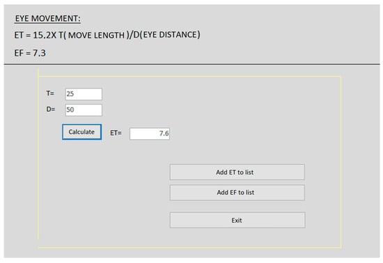 Figure 6 shows a form for selecting and calculating the time required to perform eye movements. The EF amount is fixed and is 7.3 TMU, but the ET movement is calculated using a formula and requires the actual length of the gaze shift and the distance of the eyes to be entered beforehand. The data and values for these terms can be entered into the technological worksheet by clicking on the corresponding button.
