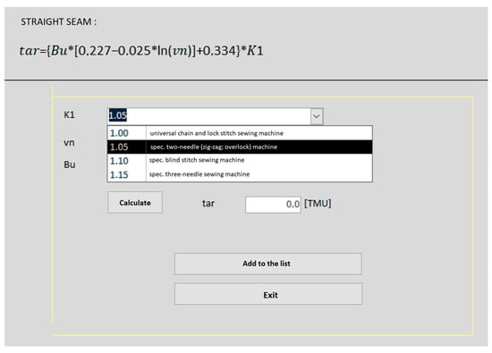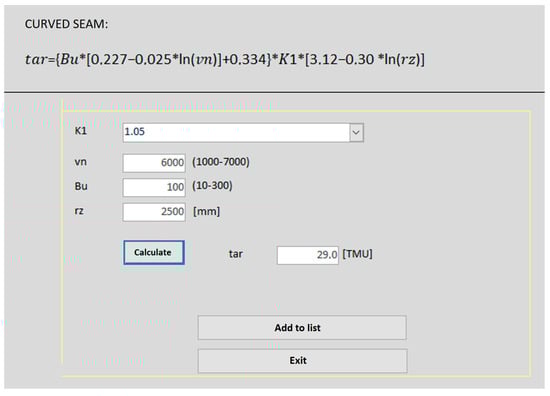 A corresponding computer program [19] was developed for these mathematical models, with which the normal time of the machine–hand sewing process can be calculated in different time units (s, TMU, min, h).
