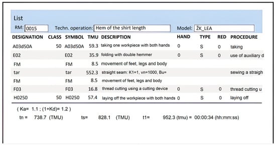 These systems are not fully applicable to the clothing industry. The technological process of sewing and the operations performed by the workers require machine–hand work, a high level of responsibility, quick reflexes, visual control of the process, and the simultaneous movement of the workers’ hands, fingers, and feet. Determining the duration of technological operations and improving working methods are extremely important in order to achieve savings in the production process, make work easier for the worker, and achieve the best and optimal work results. Our research with the MTM method focuses on clothing manufacturing processes, with an emphasis on human activities and time norms. The MTM Calculator v2.0 software was developed as a tool for experts in the clothing industry to speed up the calculation of time norms for technological sewing operations.