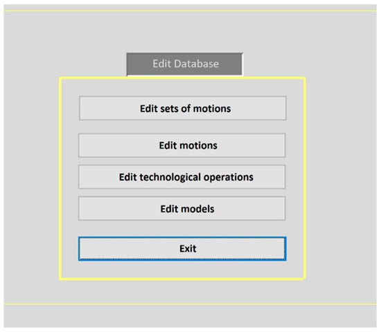 In the main menu, there is also an “Edit database” button (Figure 10), which can be used to edit four important tables in the database, namely tables related to motion sets, basic movements, the names of the technological operations, and the names of the clothing models.