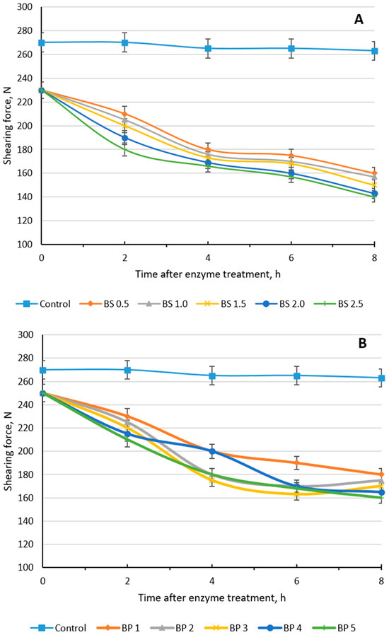 The tenderness of meat is one of the important indicators that can determine the consumer properties of the product (juiciness, softness, flavor, aroma, consistency, and appearance), and is considered one of the most important properties of cooked meat [1,2]. The level of tenderness is directly related to the composition and structure of the muscle fibers, particularly the amount and type of connective tissue present in the meat. Meat with high hardness containing a high amount of connective tissue remains just as hard after cooking, its yield decreases, losses increase, and it becomes less juicy. Further use of such meat leads to deterioration in the quality of meat products [3]. Thus, increasing the tenderness of meat and increasing the storability of meat products are important problems in meat processing. Various enzymes are used to improve the tenderness of meat [4,5,6]. Of particular interest are studies related to the application of effective enzyme preparations from cheap and readily available raw materials that do not have extraneous odors or flavors and are sanitarily safe. The use of enzymes is widespread in the food industry, which mainly utilizes three sources: microorganisms, plants, or animal tissues. Such enzymes include hyaluronidase, papain, trypsin, pepsin, ficin, protosubtilin, testipan, and others [7]. These enzymes work by breaking down tough muscle fibers and connective tissues, resulting in improved texture, increased juiciness, and enhanced overall palatability of the meat. One of the primary challenges associated with enzyme preparations in the meat industry is guaranteeing their uniform spread throughout the meat’s thickness. However, with the use of jet injection and electrophysical processing methods (electromassaging, mechanical treatment, etc.) this problem has been mostly solved [8,9].