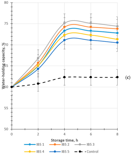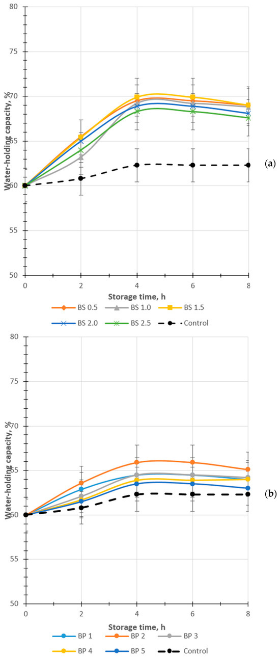 To determine the water-holding capacity (WHC), a sample of minced meat weighing 4–6 g was evenly spread with a glass rod on the inner surface of the wide part of the gyrometer. The gyrometer was tightly sealed with a cap and placed in a water bath with the narrow side down for 15 min at the boiling point of water. After that, the mass of the released moisture was determined by the number of readings on the scale of the gyrometer [41].