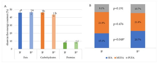 Comparison of (A) macronutrient share and (B) fatty acids in regular infant formulas (IF) and formulas for specific purposes (IF*). SFA presents saturated fatty acids, MUFA presents monounsaturated fatty acids, and PUFA represents polyunsaturated fatty acids. The same letters for the same color present no significant difference and the p-value presents the significance at α = 5%. (* represents the significant difference between samples).