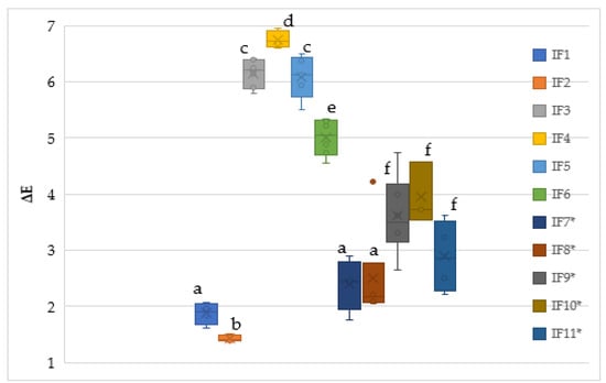 Regarding the color differences, regular infant formulas resulted in significantly higher values of ΔE (Figure 2), ranging from 1.42 (IF2) to 6.75 (IF4), while the infant formulas for specific purposes ranged from 2.39 (IF7*) to 3.95 (IF10*). Values of ΔE greater than 2 indicate that the color difference can be noticed; the color difference is clearly visible when the value ΔE is ≥3.5 [23].