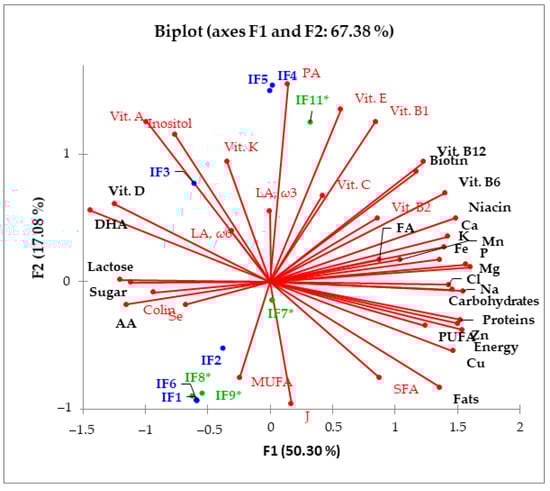 Biplot of the PCA analysis for the energy-nutritive composition of investigated infant formulas (IF-regular formulas, IF*-formulas for specific needs).
