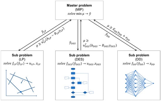 Integration concept of (MI)LP, DES, and DD using Benders decomposition.