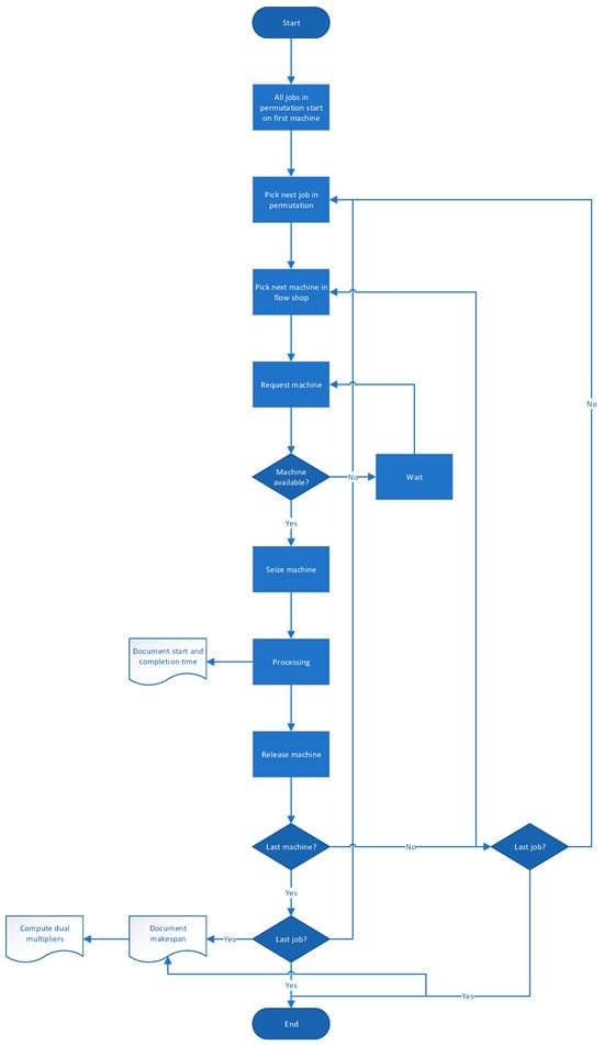 DES subproblem. The DES subproblem represents factory two and consists of a DES model of a permutation flow shop featuring machines as shown in Figure 2. Given an input job permutation , the completion times of each job assigned to this factory are computed for each machine . The objective is to minimize the makespan of this factory. From each solution of the DES model, dual multipliers are computed using the concept of critical path mapping as described in []. Based on the Benders cuts (4c) are built. The computational settings for the DES subproblem are shown in Table 2.