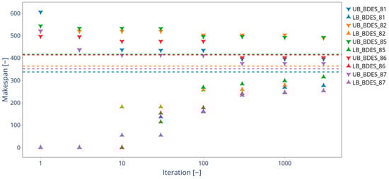 For all instances, the remaining optimality gap after 3000 Benders iterations and approximately ten hours of solution time is still more than 29 percent, as shown in Table 4, which shows some limitations of the approach. The relatively large remaining gap is due to the large number of possible solutions compared to the relatively small number of iterations and the fact that the Benders cuts cannot cover the large, combinatorial decision space sufficiently. We build the Benders cuts based on precedence variables and Big-M factors for the LP and DES subproblems to obtain a strong relaxation mechanism in the cuts. This mechanism is necessary, because a master solution that differs in one element from a previously evaluated master solution might lead to a completely different makespan. Therefore, a relaxation by is required to account for combinatorial effects for the exact LP and DES models. Furthermore, as the processing times of jobs are not factory-specific and we only use simple Benders cuts, symmetric solutions arise, which may add to the slow convergence. They could be addressed using symmetry-breaking constraints, which could lead to an improvement in the effectiveness of the cuts and tighter LBs.