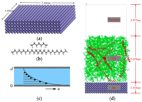 Wax deposition physical model. (a) Fe surface structure. (b) Crude oil molecular structures, (gray color for C and white for H). (c) Schematic diagram of the Couette flow shear model. (d) Computational model for wax deposition (green for C7H16 and red for C26H54 with molecules ratio of 200:10).