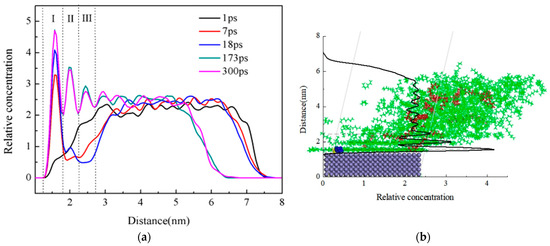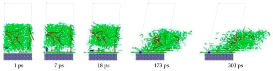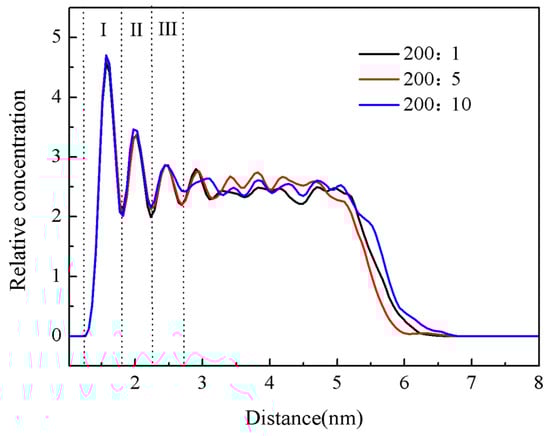 The relative concentration distribution curve is displayed in Figure 5 along the Z-axis direction. This curve depicted position changes of wax with respect to surface direction. In the beginning, a small number of wax molecules were close to the Fe surface, while the others were far away from the Fe surface and exhibited a randomly distributed free state. At this time, the peak value of the first layer was 3.292, with a thickness of 0.616 nm. Within a period of 7–18 ps, the first layer exhibited a continuous increase, but the second layer exhibited a quick increase, and a third layer started to emerge. The gradual formation of the first, second, and third layers caused the thickness to continue decreasing. At the end of the second stage, the peak value of the first layer was 4.085, with a thickness of 0.565 nm, while the peak value of the second layer was 0.959, with a thickness of 0.462 nm. At 173 ps, the concentration distribution tended to stabilize, with many more wax molecules located on the Fe surface and forming a three-layer adsorption structure. The peak value of the first layer was 4.723 with a thickness of 0.565 nm, the peak value of the second layer was 3.533 with a thickness of 0.461 nm, and the peak value of the third layer was 2.607 with a thickness of 0.513 nm. The maximum concentration of the first deposition layer was much higher than that of the following two layers. During the fourth stage, the concentration of the first sedimentary layer remained basically unchanged, but the concentration of the second and third sedimentary layers gradually decreased under shear. The shear stripping effect mainly peeled off the crude oil molecules in the second and third sedimentary layers, with little impact on the first sedimentary layer. Near the Fe surface, crude oil molecules formed a weak second and third sedimentary layer, as seen by the relative concentration distribution curve. The transition zone including the second and third layers had a larger relative concentration of crude oil molecules than the un-deposited wax, but a lower concentration than the first sedimentary layer; the reason is that the shear stripping effect mostly removed the crude oil molecule, presenting less of an impact on the initial sediments.