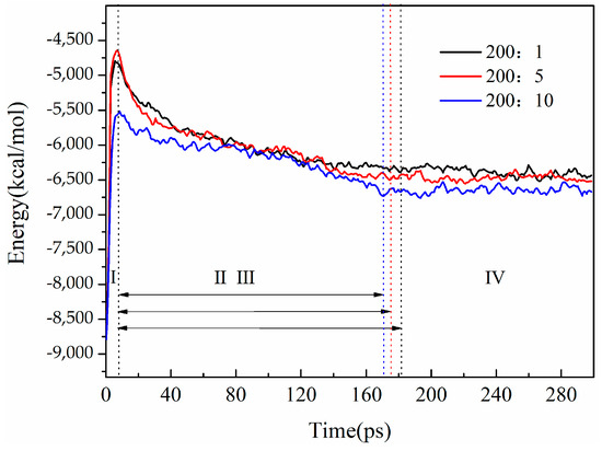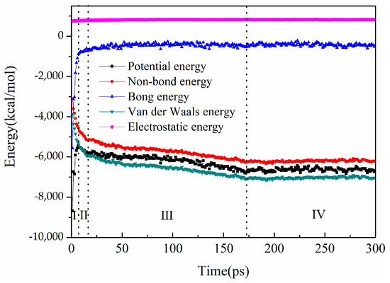 Figure 4 shows the energy variation curve of the system over time. The system equilibrium was judged by the energy equilibrium, and the energy deviation was within 5%, indicating that the system had reached equilibrium [35]. During the equilibrium trajectory in 300 ps, the potential energy was kept in a relatively stable range and fluctuations were within 5%, proving that the simulation system had reached an equilibrium state. There were four distinct stages of energy change. Because of the sharp increase in potential energy of the system with a concentration difference within 7 ps, it can be seen from Figure 2, showing the process of crude oil molecules gradually diffusing to the Fe surface under the action of molecular diffusion and shear dispersion (Stage I), the increase in system energy was mainly contributed by the vdW effect (van der Waals force effect) in non-bond energy. The adsorption of wax molecules started at the conclusion of the first stage. Simultaneously, Brownian motion modified the corresponding arrangement of crude oil molecules, causing them to adhere parallel to the surface. In 7–18 ps (Stage II), the potential energy dropped off sharply, and the vdW effect was primarily responsible for the system energy decrease. In conjunction with Figure 2, it was evident that the crude oil molecules located at a considerable distance from the oil–Fe interface experienced minimal disruption during this process, and their density variations were negligible. The decrease rate of potential energy slowed down at 18–300 ps (Stage III, IV). The third stage involved the combination of the sedimentary layer and un-deposited wax, reaching its maximum by the end of the third stage (18–173 ps).