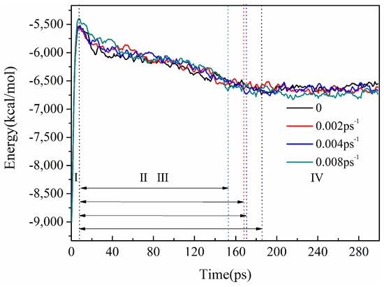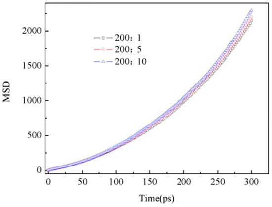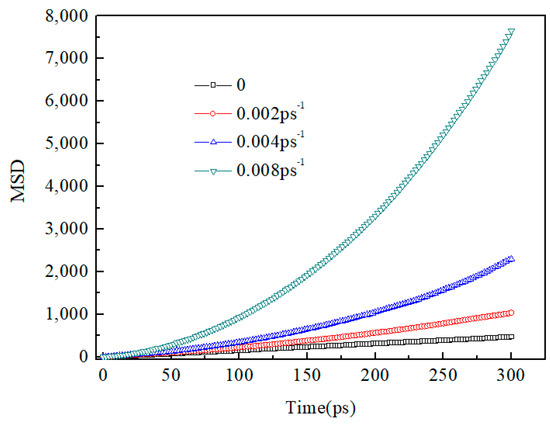 Figure 8 shows the variation of potential energy over time. As the shear rate increased, the time taken for wax deposition processes became shorter, indicating a faster wax deposition rate, which was consistent with the conclusions in references [39,40]. However, it was found that under different shear rate conditions, the time taken in the first stage was essentially the same, and as the shear rate increased, the time taken in the second and third stages became shorter. To elucidate these phenomena, mean square displacement (MSD) was extracted.