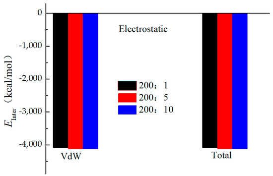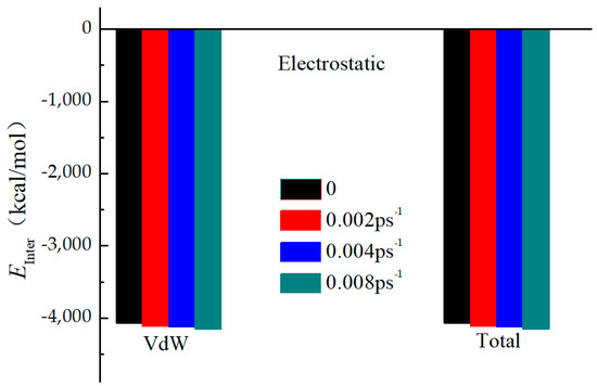 As shown in Figure 10, the composition of the contact energy between molecules of crude oil and Fe surfaces was calculated in this paper. Crude oil molecules and Fe surfaces had the electrostatic interaction energy of only 0.002–0.016 kcal/mol, meaning that there was very little Coulombic contact between the two and can be disregarded. Much larger than the electrostatic interaction energy, the van der Waals interaction energy between crude oil molecules and Fe surfaces increased gradually with an increase in wax content, with a change range of −4067.168~4147.862 kcal/mol. This suggested that van der Waals interactions account for the majority of the interaction energy between crude oil molecules and Fe surfaces. The interaction between crude oil molecules and the Fe surface steadily improved with an increase in shear rate, indicating that shear can encourage the deposition