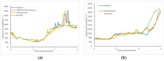- The three basic deep learning models selected in this study all have high prediction accuracy, especially in short-term runoff prediction, the fitting coefficient, R2, of which is greater than 0.873. The CNN-Bi-LSTM-Attention model has the best prediction effect, with a fitting coefficient, R2, of 0.948. Compared with that of the other two models, this represents an increase of 3.38% and 7.91%, respectively, which indicates that this model can better extract the deep features of data, capture critical hydrological information, and improve prediction accuracy.