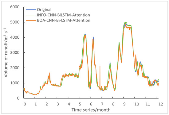 - Two optimization algorithms were selected in this study. By setting super-parameters to replace the CNN-Bi-LSTM-Attention model, it was found that compared with the BOA optimization algorithm, the improved INFO optimization algorithm used in this paper has a better prediction effect, especially for the prediction of peak value and long time series, and its fitting coefficient, R2, was as high as 0.993. This shows that the improved INFO-CNN-Bi-LSTM-Attention prediction model has a better fitting and generalization ability.