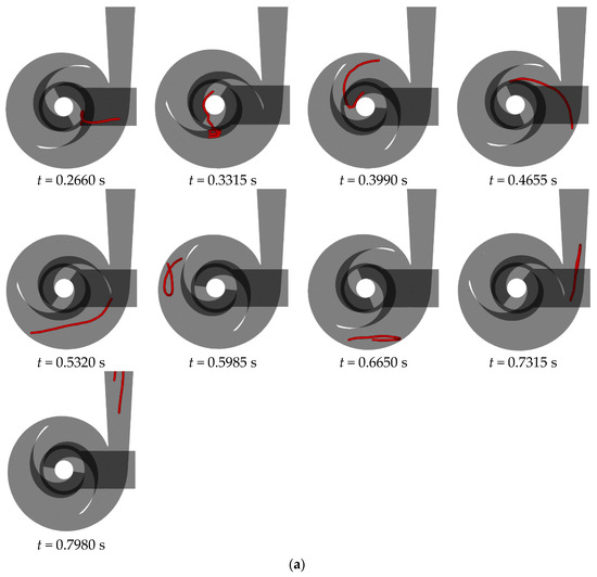 Figure 18 depicts the flow characteristics of a 250 mm flexible fiber at the rated flow rate in a double-blade non-clogging pump with various blade wrapping angles. The figure demonstrates that the fiber’s flow is markedly affected by its length. At a blade wrapping angle of 240°, upon entering the impeller, the first half of the fiber moves towards the outer side of the blade. However, the extended length of the second half prevents the fiber from exiting at the outer side, causing it to remain at the center of the impeller for a prolonged duration. During this time, the fiber’s ends repeatedly collide with the blade walls, leading to bending or aggregation. The fiber subsequently expands and aligns with the liquid phase, gradually shifting to one side. At a t of 0.7980 s, the first half of the fiber returns to the outer side of the blade, pulling the second half along. Influenced by eddy currents, the fiber forms a circular shape, which progressively extends and unfolds. Following adequate centrifugal motion within the volute, the fiber exits the volute.