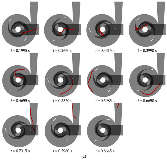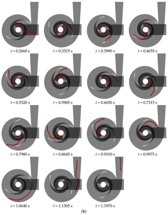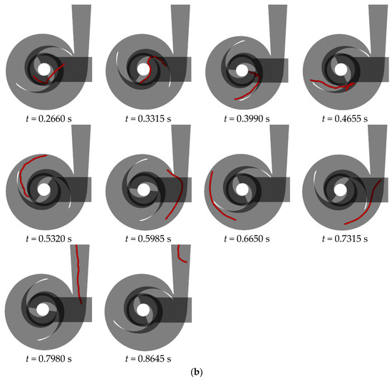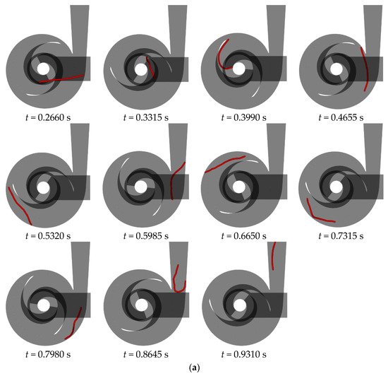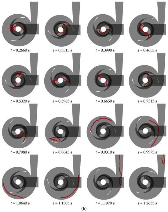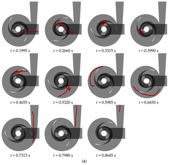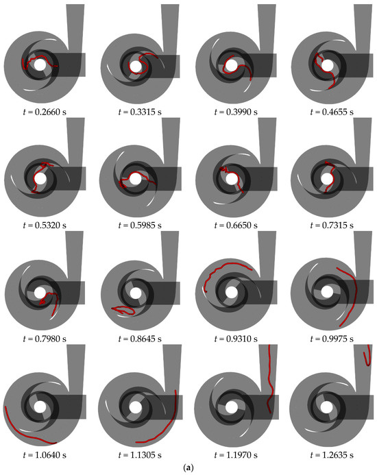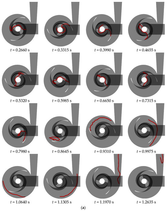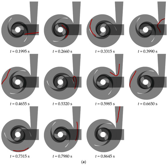 Figure 15 illustrates the flow behavior of a 200 mm long flexible fiber at the rated flow rate in a double-blade non-clogging pump with varying blade wrapping angles. A detailed analysis of the fiber’s behavior in a double-blade pump with a 240° blade wrapping angle is provided in Section 3.1. Upon entering the impeller, the fiber impacts the suction surface of the opposing blade at the inlet edge, causing aggregation of the fiber’s front half. As the liquid phase progresses, this aggregation extends and shifts from the outer side of the blade toward the trailing end, eventually leading to the fiber’s exit from the impeller. Within the volute, the fiber encounters the tongue, leading to bending and subsequent continued flow within the volute for an additional cycle before exiting.