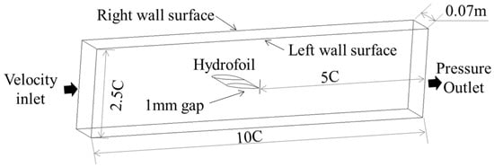 The hydrofoil studied in this paper was an NACA66, which is the same as the experimental size of the reference []. The thickest part of the hydrofoil was positioned 45% along its chord length, with a thickness-to-chord ratio of 12%. The maximum camber ratio was situated 50% along the chord length, with a camber-to-chord ratio of 2%. The chord length of the hydrofoil c was 0.075 m, the span length b was 0.069 m, and the angle of attack α was 8°. The length and height of the computational domain ware set to 10 times chord length and 2.5 chord length, respectively. The distance between the trailing edge of the hydrofoil and the outlet was 5 times chord length. The cavitation number , and the static pressure outlet p∞ were calculated by the cavitation number. The velocity inlet was a uniform flow, with turbulence intensity I = 1%. The physical properties of liquid water and water vapor in the simulation were based on their physical properties at 25 °C. The saturated vapor pressure pv was 3169 Pa. All the walls, including hydrofoils, were adiabatic and slip free. There was a 1 mm gap between the left wall of the fluid domain and the left side of the hydrofoil. The Reynolds number (Re) of incoming flow was 6 × 105 and the cavitation number σ was 0.8. The three-dimensional hydrofoil computational domain is displayed in Figure 1.