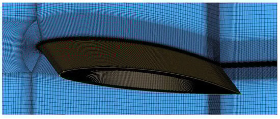 This article used ANSYS ICEM CFD (2020 R2) software (Canonsburg, PA, USA) to discretize the structured mesh of a computational domain with a 1 mm gap. In order to better match the shape of the hydro-foil and the flow domain, the grid adopted an O-H topology structure. For accurately obtaining the cavitation characteristics, an enhanced wall function was applied to solve the viscous bottom layer. The vicinity of the hydrofoil was a prism layer grid, which was divided into 80 layers. The first layer grid height was 2.8 × 10−6 mm, and the growth rate of the prism layer grid was 1.1. The dimensionless distance of y+ of the hydrofoil surface was about 1, which is suitable for simulating the inception and detachment of a cavity near the wall. Figure 2 shows the mesh details of the hydrofoil surface.