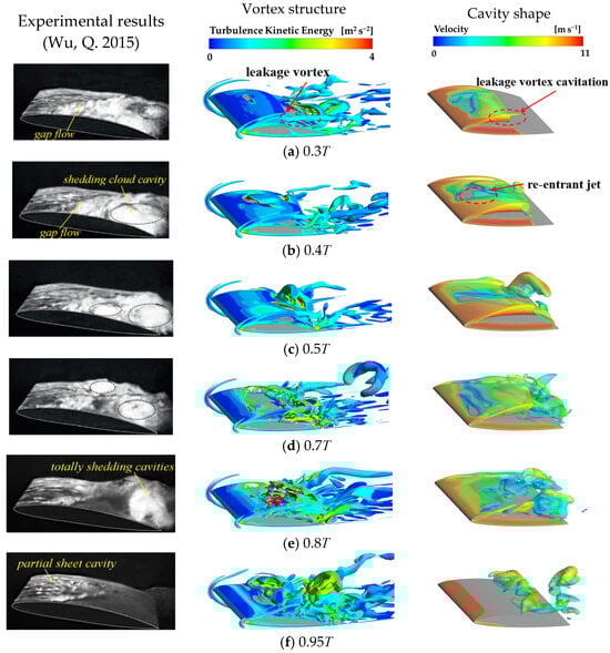 The vortex evolution and the cavity morphology of the cloud cavitation flow field during one period are shown in Figure 4. The threshold of Q was selected as 2 × 105 s−2, the surface of the vortex structure was colored by turbulent kinetic energy, while the surface of the cavity morphology was colored by velocity.