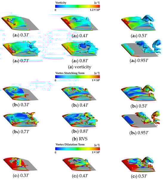 Figure 5 illustrates the evolution of vorticity, RVS, RVD, and BT on the iso-surface of the vapor volume fraction (αv = 0.1) throughout a cycle.