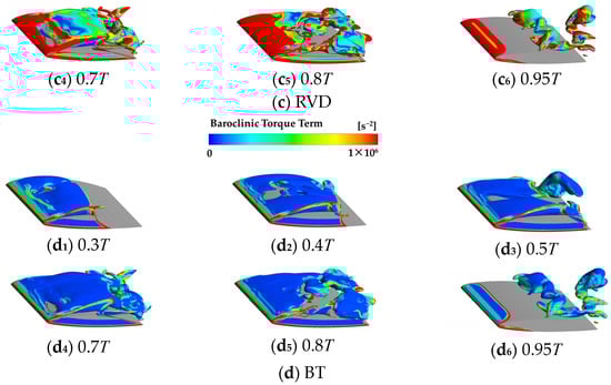 It can be seen from Figure 5 that the RVD contributes the most to the vorticity transport during the whole cavitation evolution period. The effect of the RVS on vorticity transport is slightly greater than that of the BT. Figure 5b reveals that a large RVS area existed on both sides of the cavity. The reason is that the large-scale vortex near the right wall and the left leakage cavity of the hydrofoil were replaced by the small-scale vortex. The extent of stretching and deflection of the vortices was enhanced, which led to the increase of the angular moment and the increase of the RVS. At 0.4T~0.5T, the re-entrant jet encountered the main stream near the stagnation point of the leading edge, and the transition region was disturbed. The velocity gradient between the cloud cavity and the main stream increased, which increased the RVS. As depicted in Figure 5c, in the growing period of the cavity (0.3T~0.4T), the RVD promoted the growth of cavitation. During the shedding period of the cavity (0.5T~0.8T), the volume of the cloud cavity increased continuously, the expansion ability of the vortex was weakened, and the ability of the RVD to transport the vorticity was suppressed. As depicted in Figure 5d, the BT was very small during the entire evolution of the cavity, which mainly appeared at the boundary of the cavity closure area.