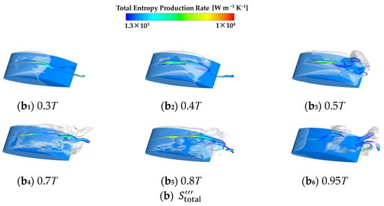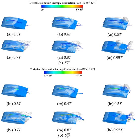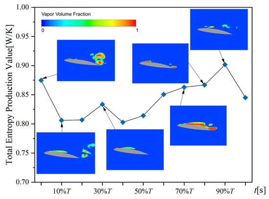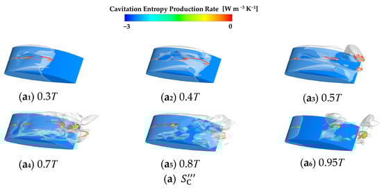 - During the phenomenon of cloud cavity shedding and collapse, the total entropy production value in the flow field is significant. When the cavity collapses, the total entropy production value reaches its peak value. The turbulent dissipation entropy production rate is predominantly localized in the fluid domain below the lifted attached cavity and within the vortex induced by the cloud cavity, accounting for over 80% of the total entropy production. The direct dissipation entropy production rate primarily occurs near the stagnation point of the hydrofoil’s leading edge and inside the cavity. The wall entropy production rate is concentrated in uncovered cavity areas, while the cavitation entropy production rate is mainly concentrated on the vapor–liquid interface.