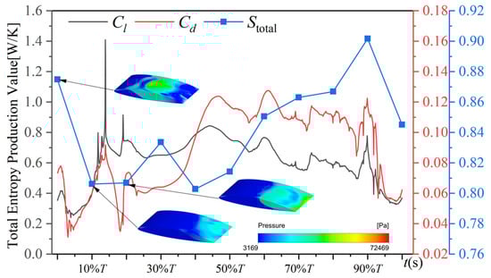 Figure 7 shows that in the range of 0T to 0.15T, the low-pressure region on the upper surface of the hydrofoil gradually expanded, resulting in an increase in the lift coefficient. Simultaneously, the energy loss of the flow field dropped sharply, which indicates that the vortex structure remaining in the last cycle gradually dissipated. At 0.5T~0.9T, the cloud cavity was cut off by the re-entrant jet, then fell off, moved downstream and collapsed, and the irreversible loss increased. Simultaneously, the turbulence in the cavitation flow field intensified, leading to more complicated vortex evolution. This complex evolution of the cavity led to oscillations in the lift and drag coefficients of the hydrofoil.