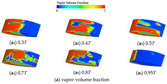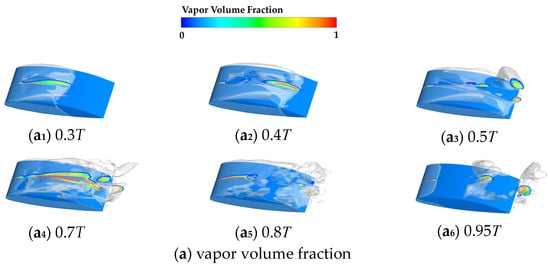 In order to analyze the relationship between the vapor volume fraction and the distribution, Figure 12 demonstrates the changing process of the vapor volume fraction and the on the hydrofoil surface. The shape of the cavity was selected as the iso-surface with volume fraction αv = 0.1.