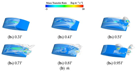 For analyzing the relationship between the cavity shape and , Figure 11 presents the cavity shape (αv = 0.1), the , and the at a cross-section of the hydrofoil in a cycle. In the distribution, the negative value represents the condensation process and the positive value represents the evaporation process.