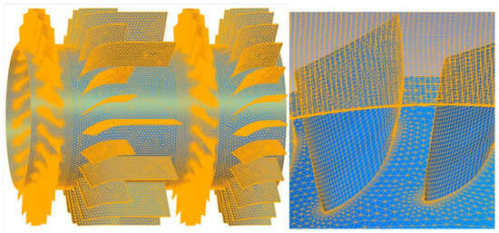 The grid division employs a strategy of block partitioning, partitioning different computational regions for the inlet, impeller region, stator region, and outlet diffuser section, respectively [26]. In the impeller and stator regions, an adaptively strong unstructured grid is used for grid generation. In other regions, a hexahedral structured grid is employed. Additionally, a boundary layer grid is applied to the impeller surface, and a size function is used to grid refine local areas such as the leading and trailing edges of the blades and the gap at the blade tip. The grids in the impeller–stator regions and the impeller blade tip region are illustrated in Figure 2.