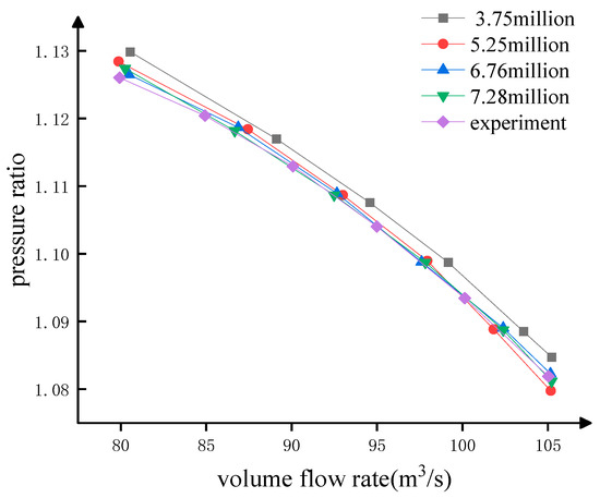When conducting CFD simulations using Fluent (https://www.ansys.com/products/fluids/ansys-fluent, accessed on 6 May 2024), it is essential to perform a grid independence test to ensure the accuracy of the simulation results and reduce the workload. The main task is to find the minimum number of grid elements that make the CFD results independent of the grid size. As shown in Figure 3, six different grid sizes were set. It can be seen that, when the grid numbers reach 6.76 million, the numerical results agree well with the experimental results obtained by the fan manufacturer. In the grid independence calculation, we obtained the number of elements by varying the number of internal points on the edge of the blades and the maximum size from 10 to 30 mm.