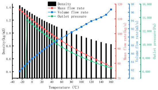 Table 2 lists various fluid properties, which are the parameters needed for the numerical simulations of fluid. These parameters, such as density, specific heat capacity, thermal conductivity, and dynamic viscosity, primarily vary within a temperature range of −25 –150 °C. The specific values are calculated based on the REFPROP model of the National Institute of Standards and Technology (NIST) in the United States. In practical situations, when the fluid is air, the temperature ranges from −25 °C to 50 °C, and when the fluid is flue gas, the temperature ranges from 150 °C to 160 °C. In order to make the curve graph coherent, the calculated air temperature range is set to −25–150 °C. Figure 4 shows the curves of fluid density, fan mass flow rate, fan volumetric flow rate, and fan outlet pressure as functions of the fluid temperature under the condition where the throttle valve of the axial-flow fan used in the power plant is fully open. Under constant fan speed conditions, as the fluid temperature rises, the fluid density gradually decreases. Consequently, the mass flow rate of fluid within the fan gradually decreases, leading to a synchronous decline in outlet pressure. However, the volumetric flow rate of fluid exhibits an increasing trend. This indicates that the changes in various monitored parameters are interrelated. The decrease in fluid mass flow rate is insufficient to offset the impact of reduced density, resulting in an upward trend in the volumetric flow rate.
