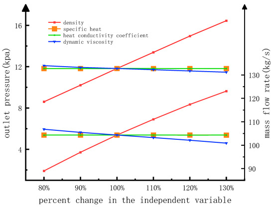 From Figure 4, it can be seen that there is a functional relationship between independent and dependent variables. The variation should be explored from the perspective of influencing mechanisms and should not be merely represented as a change in temperature. To investigate the impact of air parameters on the operation of an axial flow fan, density, specific heat capacity, thermal conductivity, and dynamic viscosity are individually used as independent variables for numerical simulation. Under the condition of changing only one independent variable, with 20 °C air as the 100% initial state, each variable is changed by 10% of the initial state. The outlet pressure and mass flow characteristic curves are shown in Figure 5. It should be noted that the gas may not exist under this condition; it is solely for numerical simulation exploration.