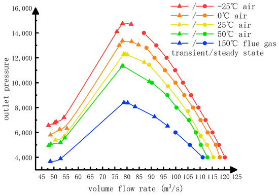 Figure 6 shows the total pressure-volume flow rate characteristics obtained through the transient and steady-state numerical calculations of the fan under different working temperatures with air and flue gas as the working fluid. In thermal power plants, axial flow fans are used for both the forced draft fan and the induced draft fan. The forced draft fan supplies combustion air to the boiler, while the induced draft fan extracts the flue gas after combustion from the furnace. Therefore, when the working fluid is air, temperatures of −25 °C, 0 °C, 25 °C, and 50 °C are selected, and when the working fluid is flue gas, a temperature of 150 °C is chosen. The characteristic curves corresponding to each working fluid are discontinuous. The left side interruption in the middle represents transient conditions under different control valve openings, while the right side represents steady-state numerical calculations under different back pressures when the control valve is fully open.