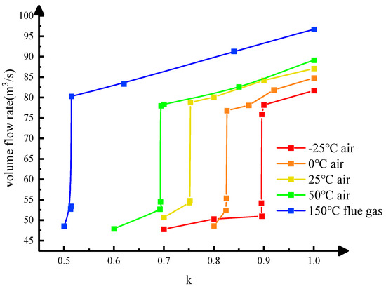 Figure 7 illustrates the characteristic curves of throttle valve opening versus volumetric flow rate obtained through the transient simulations of the fan under different working temperatures for air and flue gas. In the transient calculation phase, as the valve opening decreases, the fan flow rate decreases. After the flow rate decreases to 78 m3/s, with a further reduction in the valve opening, the flow rate rapidly drops to 55 m3/s, indicating that the fan enters a state of rotational stall. Combined with the figure, although the valve opening values corresponding to the occurrence of stall differ for different temperatures, the fan flow rate at the stall is consistently 78 m3/s. The valve opening coefficients (k values) corresponding to the stall for air temperatures of −25 °C, 0 °C, 25 °C, and 50 °C are 0.895, 0.825, 0.752, and 0.693, respectively. For flue gas at 150 °C, the corresponding k value at stall is 0.514.