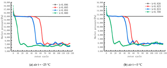 By monitoring the fan’s outlet static pressure, the presence of periodic fluctuations can be verified, serving as an indicator of whether the fan has entered the rotational stall. Figure 8a illustrates the variations in fan outlet static pressure over time at different valve opening coefficients (k values) for an air temperature of −25 °C. At k = 0.896, corresponding to a fan flow rate of 78.0 m3/s, the outlet static pressure rapidly decreases and quickly stabilizes at 14,939 Pa. As the valve opening decreases further to k = 0.895, the flow rate significantly decreases to 52.7 m3/s. After approximately seven rotor cycles, the fan achieves a stable outlet static pressure. However, around the 45th rotor cycle, the outlet static pressure struggles to maintain stability, experiencing a sharp drop. Subsequently, after approximately 25 rotor cycles, it enters a new stable state with pressure fluctuations ranging between 6850 Pa and 7480 Pa. At the adjacent valve opening of k = 0.894, there is no significant change in flow rate compared to the previous opening. However, a pressure drop occurs in a shorter time, around the 36th rotor cycle, and eventually enters a state of pressure fluctuations, with the maximum fluctuation equal to that at k = 0.895 and a minimum of 6278 Pa. At k = 0.8, the fan cannot reach a stable state, experiencing a rapid decrease in outlet static pressure. Around the 17th cycle, it reaches the first extreme point, gradually entering a periodical fluctuation state. In all three rotational stall states, after a rapid decline in outlet static pressure, there is a small increase followed by irregular oscillations. As k decreases, the range of stall-induced fluctuations gradually diminishes.