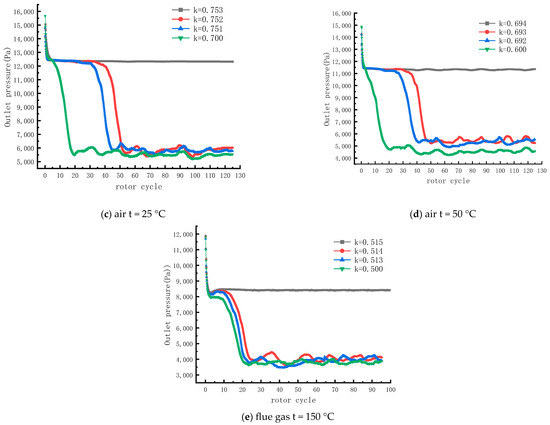 Figure 8b–d depict the variations of fan outlet static pressure over time at air temperatures of 0 °C, 25 °C, and 50 °C, respectively. Figure 8e represents the variation in fan outlet static pressure over time at flue gas temperatures of 150 °C. A comparison of these figures reveals that the overall shapes of the curves depicting the process of the fan entering the stall under different valve opening coefficients (k values) are similar for both air and flue gas. As the valve opening decreases, the fan transitions from a stable state to stall, and the five sets of curves are sorted in descending order of fluid density. With decreasing density, the k value at which the fan first enters the stall gradually decreases. The number of rotor cycles from maintaining a stable state to entering stall decreases, becoming 45, 40, 34, 30, and 11 cycles. The intervals between two stall curves decrease when k further decreases by 0.001, becoming 14, 11, 11, 9, and 3 cycles. Before stall, the mass flow rates for the fan under stable conditions are 111.3 kg/s, 94.2 kg/s, 92.4 kg/s, 85.3 kg/s, and 63.1 kg/s, with corresponding volumetric flow rates of 78.2 m3/s, 78.1 m3/s, 78.0 m3/s, 78.3 m3/s, and 78.7 m3/s. All fan conditions before stall fall within the approximate range of 78.2 m3/s. Subsequently, as k decreases slightly, the throttle valve experiences a stall. The decrease in fluid density causes a simultaneous decrease in the fan’s mass flow rate, but the volumetric flow rate remains essentially unchanged. The volumetric flow rate of the fan is a crucial indicator for determining whether a stall occurs.