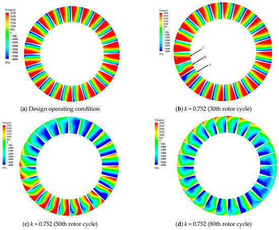 Figure 9b illustrates the internal pressure distribution within the impeller at the 30th rotor cycle moment when the valve opening is k = 0.752, representing the initial state of fan stall occurrence. It can be observed from the graph that stall first occurs at the top of the blade suction surface. In the adjacent regions of the two blades, the negative pressure area at the top of blade A’s suction surface expands, gradually extending from the root to the midsection of the blade. In the clockwise adjacent blade B, the expansion trend of the suction surface’s negative pressure area is similar to A, but the pressure value of the negative pressure area decreases, approaching 0 Pa pressure. In the clockwise adjacent blade C, the negative pressure region on the suction surface decreases, and the minimum pressure area of −4000 Pa disappears. The high-pressure region on the pressure surface expands to three-quarters of the entire blade surface. There is a significant static pressure difference compared to the first two blades, causing abnormal airflow due to the pressure gradient. In the AB channels, the originally small negative pressure area near the top of the suction surface has developed into a large area of negative pressure with relatively high pressure values from the root to 80% of the radial height, resulting in nearly half of the channel being blocked.