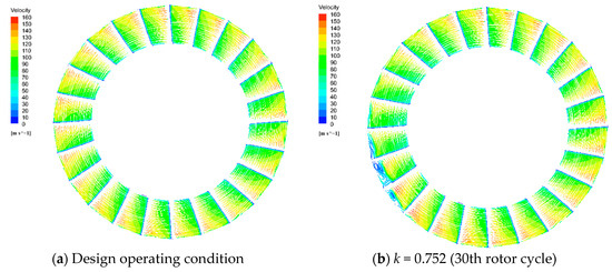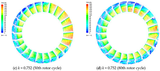 Figure 11 illustrates the distribution characteristics of the velocity streamlines between the blades. As can be seen from Figure 11a, the flow field inside the impeller exhibits uniform velocity streamline characteristics when the turbine is away from the stall condition. However, with the gradual decrease in flow rate, the flow field develops to the early stage of stall shown in Figure 11b, and the fluid in some flow channels starts to show obvious and violent disturbances, leading to a significant increase in the disturbance of the flow field inside the impeller. Entering the 80th rotor cycle shown in Figure 11c, the precursor of the stall has evolved into a complete stall mass that rotates along the impeller at a stable rotational speed, at which time the circumferential inhomogeneity of the flow field is further aggravated, and the flow structure is seriously damaged. Accompanied by the further reduction in flow rate, the deep stall state demonstrated in Figure 11d is basically the same as that in Figure 11c, which further confirms the serious inhomogeneity of the pressure distribution.