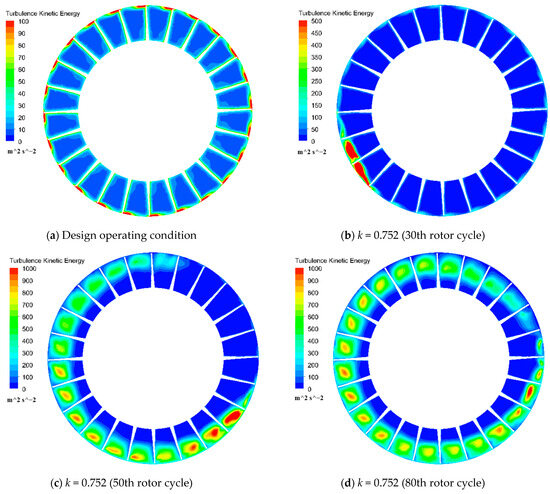 As the impeller continues to rotate, the flow field gradually evolves to the state shown in Figure 13c, at which point widespread stall occurs inside the impeller. From the figure, it can be seen that the impeller channels are affected by the stall cell, resulting in non-uniform circumferential distribution. The flow field is significantly affected in 18 consecutive channels, with the 12 channels near the tail (considering the clockwise rotation of the impeller as positive) experiencing the most severe damage, indicating the region where the stall cell is generated. The small-range high-turbulent-energy area originally distributed near the blade top in the aforementioned channels develops into a large-area region from the blade top to approximately 50% of the radial height, and the turbulent kinetic energy values also significantly increase. In the channel affected by the stall cell in the counterclockwise direction, there is also a trend of an increasing high-turbulent-energy area. In contrast, the high-turbulent-energy area at the blade top in the seven channels affected by the stall inception in the clockwise direction (impeller rotation direction) is reduced compared to Figure 13b.