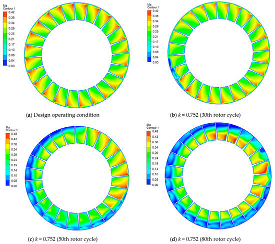 Figure 14 illustrates the characteristics of the Mach number distribution in the axial section at Z = 0 for four typical moments before and after the onset of impeller stall. From Figure 14a, it can be seen that, when the turbine is in a state far from stall, the relative velocity inside the impeller shows a uniform distribution of Mach number, and the flow lines develop in a circumferential direction along all flow paths, and no relative velocity change in the radial height of the blades is observed. Influenced by the circumferential velocity, the Mach number gradually increases from the hub to the tip of the blade. When the flow rate decreases to the initial stage of the stall shown in Figure 14b, a significant and violent disturbance of the fluid in part of the flow channel occurs, resulting in a significant decrease in the relative velocity of the fluid in this region, and the Mach number decreases significantly. Further developed to the 80th rotor cycle shown in Figure 14c, the circumferential inhomogeneity of the flow field inside the impeller is significantly intensified, the low Mach number region is continuously expanded, and the flow structure has been seriously damaged. When the flow rate is further reduced to the deep stall condition shown in Figure 14d, the low Mach number region has extended to the whole impeller, indicating that the flow performance has been fully destabilized. This process clearly reflects the drastic change in the flow state at the onset of stall and its significant impact on the impeller performance.