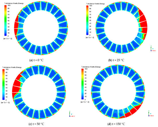 The contour plots of turbulent kinetic energy at Z = 0 corresponding to the occurrence of stall in axial flow fans under different air temperatures, as shown in Figure 15a–d. indicate that the initial location of stall occurrence is not fixed. Stall always initiates from a specific location and gradually expands, with no simultaneous occurrence at multiple locations. In comparison to locations where stall has not occurred, temperature variations have no impact on the normal flow conditions. High-turbulent kinetic energy is concentrated at the suction side of the blade tip, induced by blade tip leakage flow. As the flow rate decreases and stall occurs, disturbances in air flow are generated, and the leakage flow within the blade passage gradually intensifies. The fluid motion trajectory, formed by the mixture of blade leakage flow and the mainstream, undergoes significant changes, leading to the formation of a larger extent of stall under mutual influence.