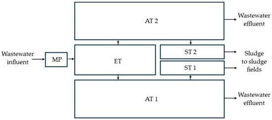 Scheme of reconstructed WWTP to AGS system. MP—mechanical pretreatment (fine screens and sand trap); ET—equalization tank; AT1, AT2—activation tanks (reactors AS-GranBio); ST1, ST2—tanks for excess sludge storage.