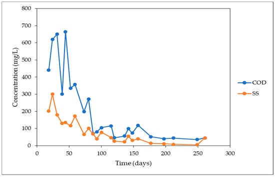 From these figures, it is evident that during the adaptation of the sludge to conditions suitable for the growth of aerobic granular biomass, all monitored parameters gradually decreased. The COD values declined, and with the improvement of AGS sedimentation properties, the concentrations of suspended solids also decreased (Figure 3).