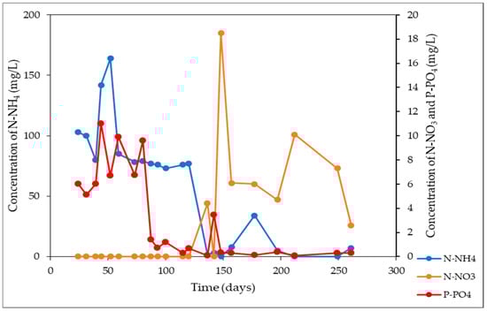 In Figure 4, peaks in N-NH4 (approx. 50th day) and N-NO3 (approx. 150th day) concentrations are evident. These values and their subsequent reduction illustrate the optimization of the length of individual phases of the semi-continuous cycle and its total length. The total length of the cycle was set to 6 h after optimization, and the lengths of the individual phases are illustrated in Figure 2. The peak in the concentration of N-NH4 on the 50th day corresponds to a still unstable treatment process, when at high concentrations of COD nitrification does not take place (Figure 3). Stable nitrification started only after about 75 days of operation of the WWTP, which is evident from the permanent decrease in N-NH4 and increase in N-NO3. The peak of N-NO3 at about day 150 illustrates complete nitrification, without denitrification. It can be assumed that the sludge has not yet been sufficiently aggregated, but the subsequent decrease in N-NO3 already indicates the start of denitrification and granulation of the activated sludge. This means that the sludge-granulation time in the WWTP was after the 150th day. The work [] states that it is possible to grow granulated biomass even with the use of real wastewater, but the granulation time is longer than 50 days. With the use of synthetic substrates, such as volatile fatty acids, granulation can be significantly faster.