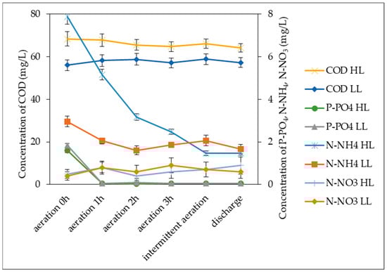 The results of the concentration monitoring of individual parameters are shown in Figure 5. In this figure, we can see that the only significant concentration profile during the semi-continuous cycle can be observed in the case of N-NH4, where its concentration at the inflow on higher load days was significantly higher than on the lower load days. However, the output concentrations of N-NH4 at the WWTP outflow were not affected by this.