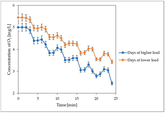 We conducted operational measurements at the WWTP on two separate days, during which different quality inflows to the WWTP were expected due to the unregulated discharge of septic tank wastewater and household operations over the weekend. Long-term measurements showed higher inflow concentrations at the WWTP on Tuesdays compared to the relatively average inflows on Fridays. The values of selected average parameters of wastewater inflow to the activation tank are listed in Table 3. The average values were calculated from three Tuesdays (higher load, HL) and three Fridays (lower load, LL) measurements. These values confirm the assumption of poorer wastewater quality at the beginning of the week. The difference in quality is not too significant, as it is partially balanced by the homogenization tank.