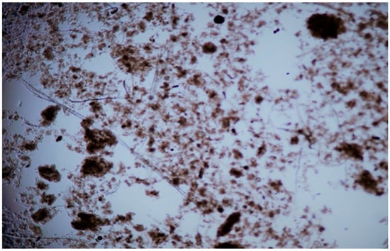 The low concentrations of N-NO3 and P-PO4 at the tank outflow indicate the presence of an anoxic to anaerobic core within the sludge agglomerates, which allows these processes to occur at the micro-level through the segregation of anoxic or anaerobic zones within the agglomerates. Such conditions in the agglomerates are reported in many studies dealing with this issue [,,,]. The formation of sludge agglomerates is illustrated by the microscopic image shown in Figure 7. At 60× magnification, it is clear these agglomerates have formed, and even in smaller flocs, a denser core is evident.